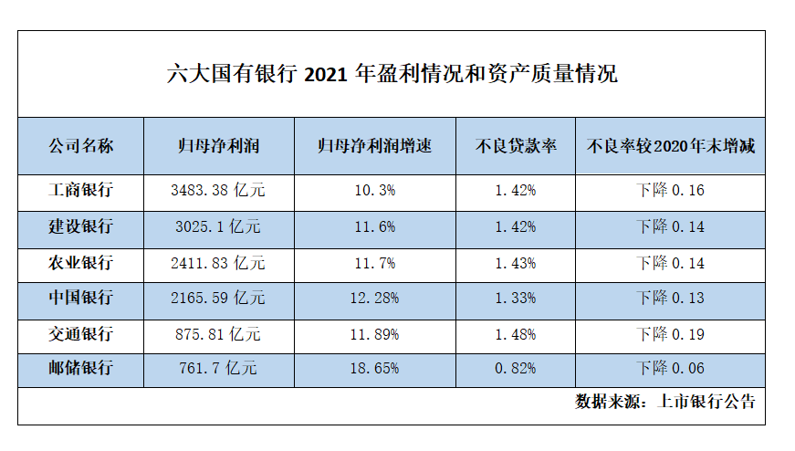 2021年,银行业整体保持了稳健的盈利能力。银保监会数据显示,2021年全年商业银行累计实现净利润2.2万亿元,同比增长12.6%。记者梳理发现,6家国有大行整体经营表现超出预期,净利润增速均达到10%以上。