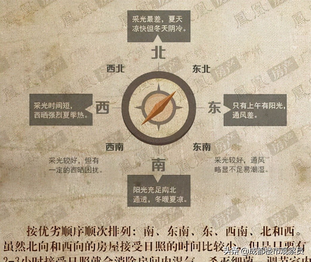 朝向:朝向事关采光,或者说阳光的多少,具体区别如下。