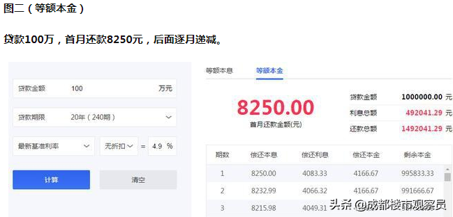 举个例子,贷款100万元,贷款周期20年,贷款利率4.9%计算: